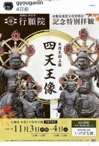 倉敷市西岡のお寺、行願院で行われる四天王像特別拝観。同日開催されるいけばな展の一環として倉敷グリーンファームも苔玉づくり体験(3日のみ)で参加します。心落ち着く境内で秋の苔玉づくりをお楽しみください。ご予約不要、所要時間は30分程度、体験料は2,500円です。ご来店お待ちしております。